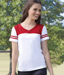 4.5 oz. • 100% combed ringspun cotton jersey • Topstitch ribbed v-neck collar • Taped neck with EasyTearTM label • Contrast yoke front, back and stripes on sleeves • Double-needle hem sleeves and bottom • White is sewn with 100% cotton thread • Sizes: S-2XL