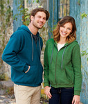 50% preshrunk cotton/50% polyester • 8-oz. • air jet yarn for softer feel • cross-dyed shades (2 colors in one fabric) • single-ply hood • contrast dark grey flat drawcord • YKK brass zipper with contrast dark grey trim • pouch pockets • triple-needle top-stitched hood • pocket opening and waistband • 1x1 athletic rib with spandex • quarter-turned to eliminate center crease • Sizes: S-2XL