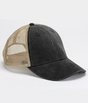 100% cotton • garment- washed and pigment- dyed on front two panels and visor • 100% nylon mesh on tan back panels • structured • mid- profile • 6- panel • updated trucker style • distressed torn visor • cotton twill sweatband and matching plastic back tab closure • 4"w x 2"h imprint area • Sizes: one size