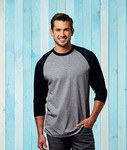 preshrunk 100% cotton jersey knit • 5.3 oz. • contrast color set-in collar and 3/4 raglan sleeves • single-needle topstitched back neck • double-needle sleeve and bottom hems • quarter-turned to eliminate center crease • tear-away label • Sizes: S-3XL